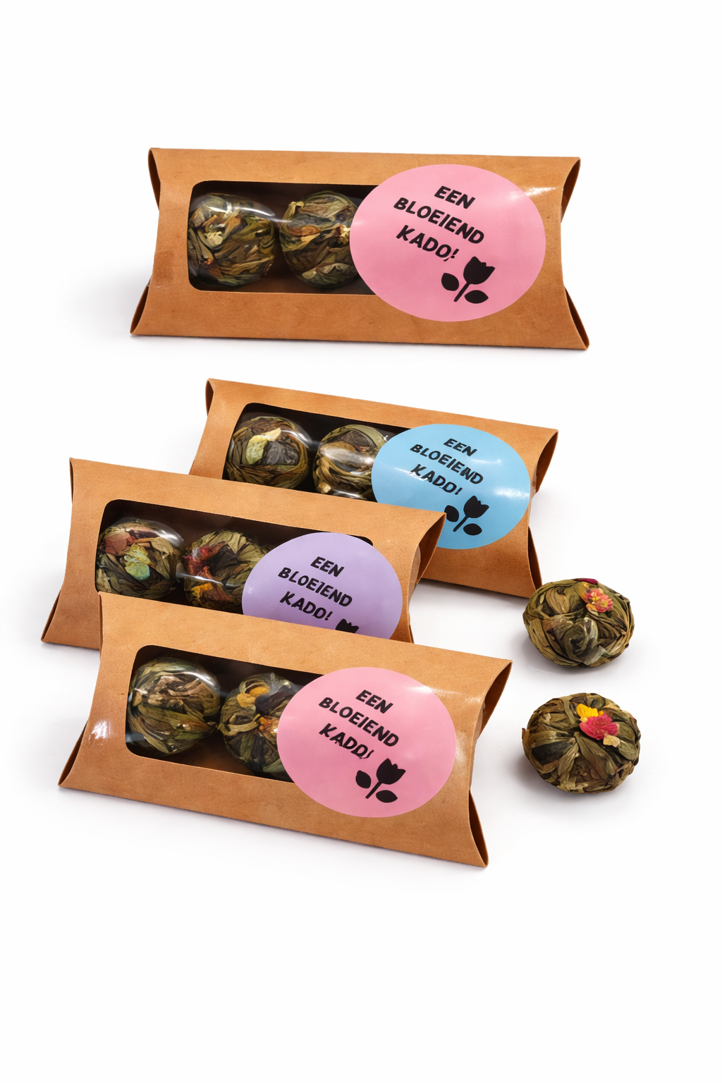 Een bijzonder theemoment in een doosje. Deze cadeauset bevat drie prachtige theebloemen die zich tijdens het zetten langzaam ontvouwen tot een kleurrijk spektakel. Een echte beleving voor het oog én een zachte, verfijnde thee om van te genieten.