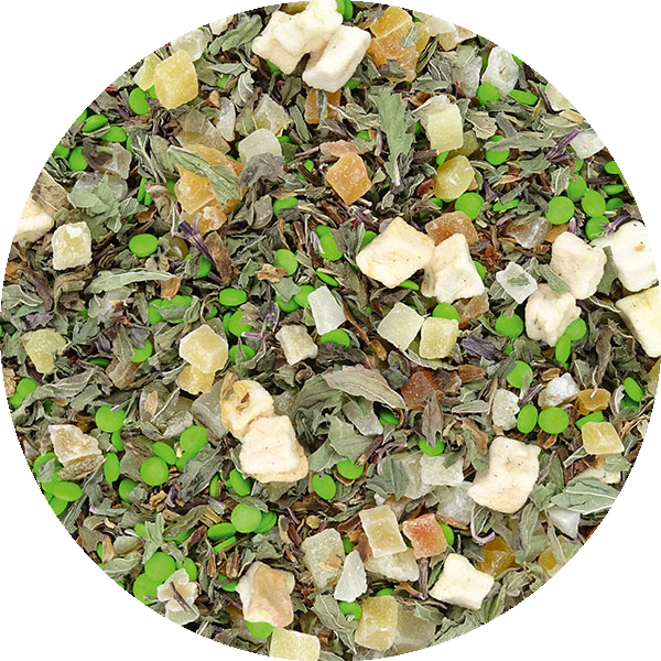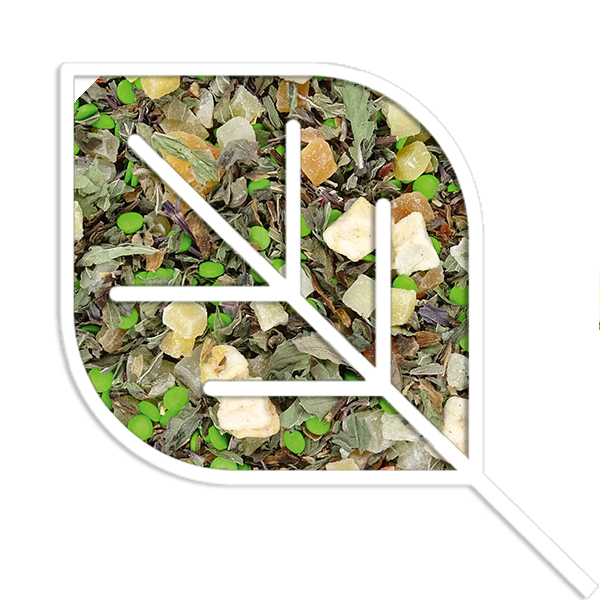 Ingrediënten: Gesuikerde mangostukjes (mango, suiker, voedingszuur: citroenzuur), gesuikerde papajastukjes (papaja, suiker), groene decoratiestukjes (erythritol, zonnebloemolie, aardappelzetmeel, rijstmeel, glansmiddel: E464, natuurlijk vanillearoma, kleurstoffen: E101, E133), hibiscus, pepermunt (10%), appelstukjes (appel, antioxidant: citroenzuur, zout) (8%), natuurlijk aroma, natuurlijk groene munt aroma.