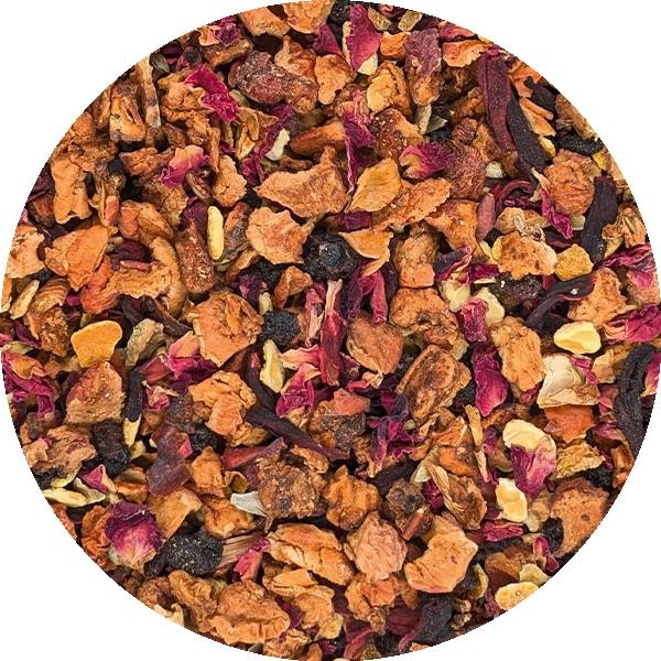 Ingrediënten: appelstukjes, bessenmix (hibiscus, zwarte bessen (met zonnebloemolie), vlierbessen), sinaasappelschil, rozenblaadjes, natuurlijk aroma
