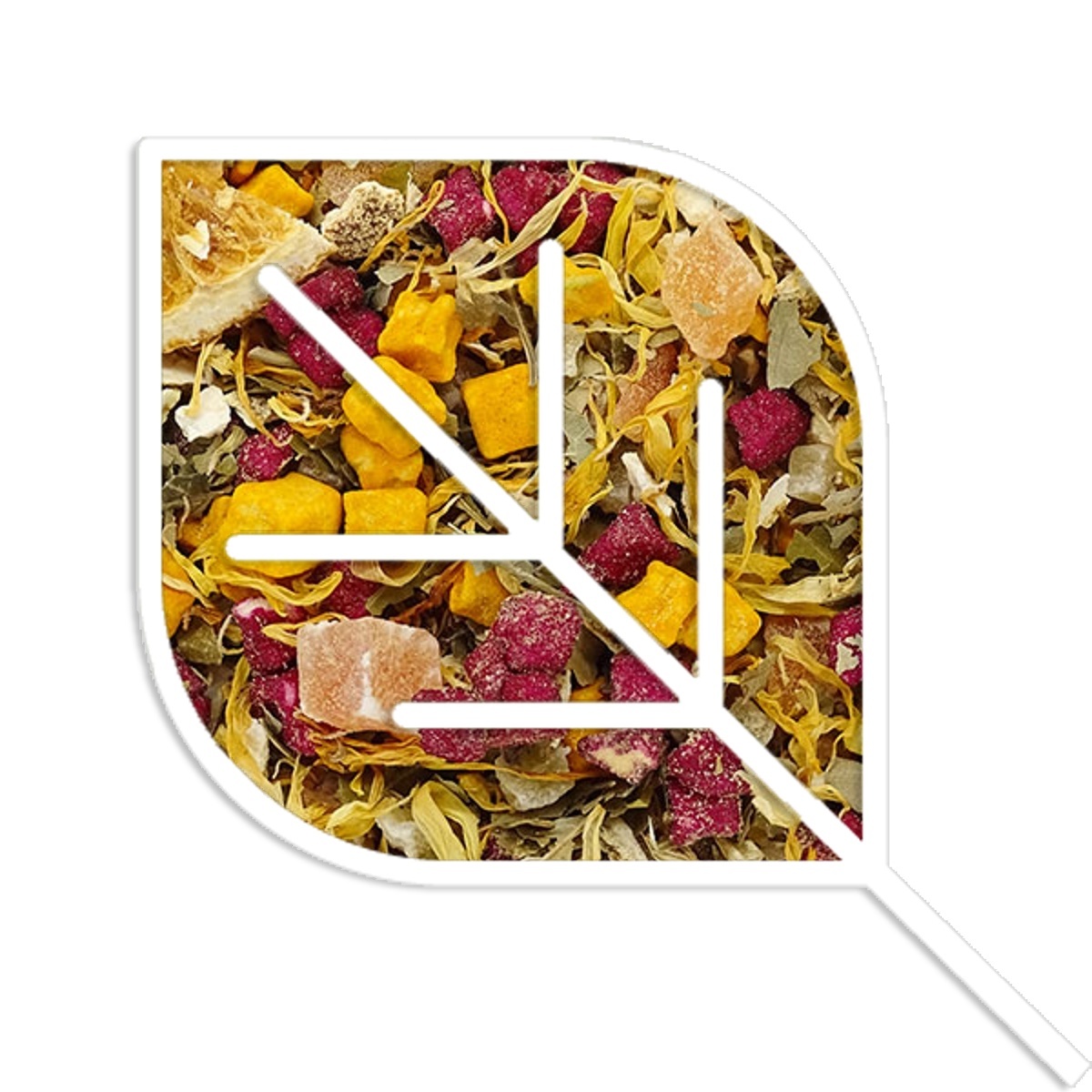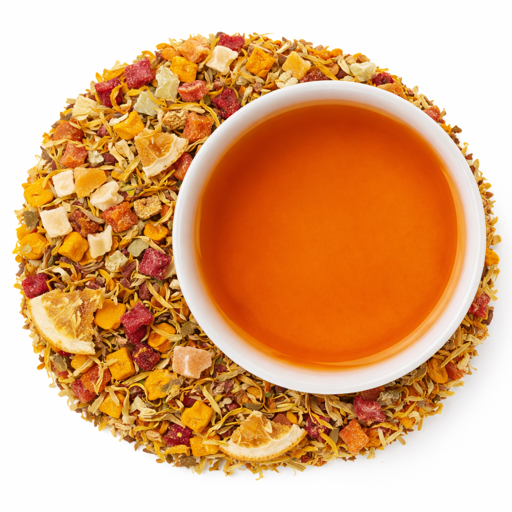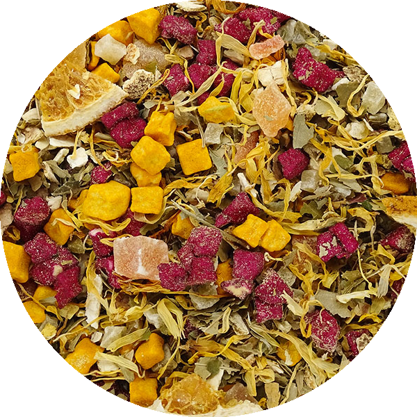 Gekonfijte papajastukjes (papaja, suiker), gekonfijte ananasstukjes (ananas, suiker, voedingszuur: citroenzuur), appelstukjes (appel, gemalen kurkumawortel), appelstukjes (appel, rode biet kleurconcentraat (maltodextrine, kleurend concentraat uit rode biet, antioxidant: ascorbinezuur)), sinaasappelschillen (13%), zoete bramenbladeren, sinaasappelschijfjes (4%), vitaminemix (ascorbinezuur, niacine, vitamine E, pantotheenzuur, vitamine B6, vitamine B2, vitamine B1, foliumzuur, biotine, vitamine B12, drager: gedroogde glucosestroop), aroma, goudsbloembloemen, natuurlijk sinaasappelaroma, natuurlijk aroma, natuurlijk komkommeraroma.