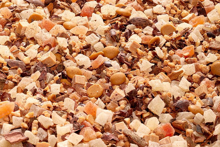 Ingrediënten:gesuikerde ananas (ananas, suiker, citroenzuur), amandel krokant (suiker, amandel), gesuikerde papaya (suiker, papaya) kaneel, cacao doppen, caramel blokjes (gezoete gecondenseerde magere melk, suiker, glucose, siroop, botervet, bevochtiger; sorbitol siroop; mono- en diglyceriden van vetzuren)(6%), aroma, chocolade druppels caramel (suiker, cacaoboter, volle melkpoeder, magere cacaopoeder, emulgator; zonnebloemlecithine, aroma, kleurstof; paprika extract) (4%)