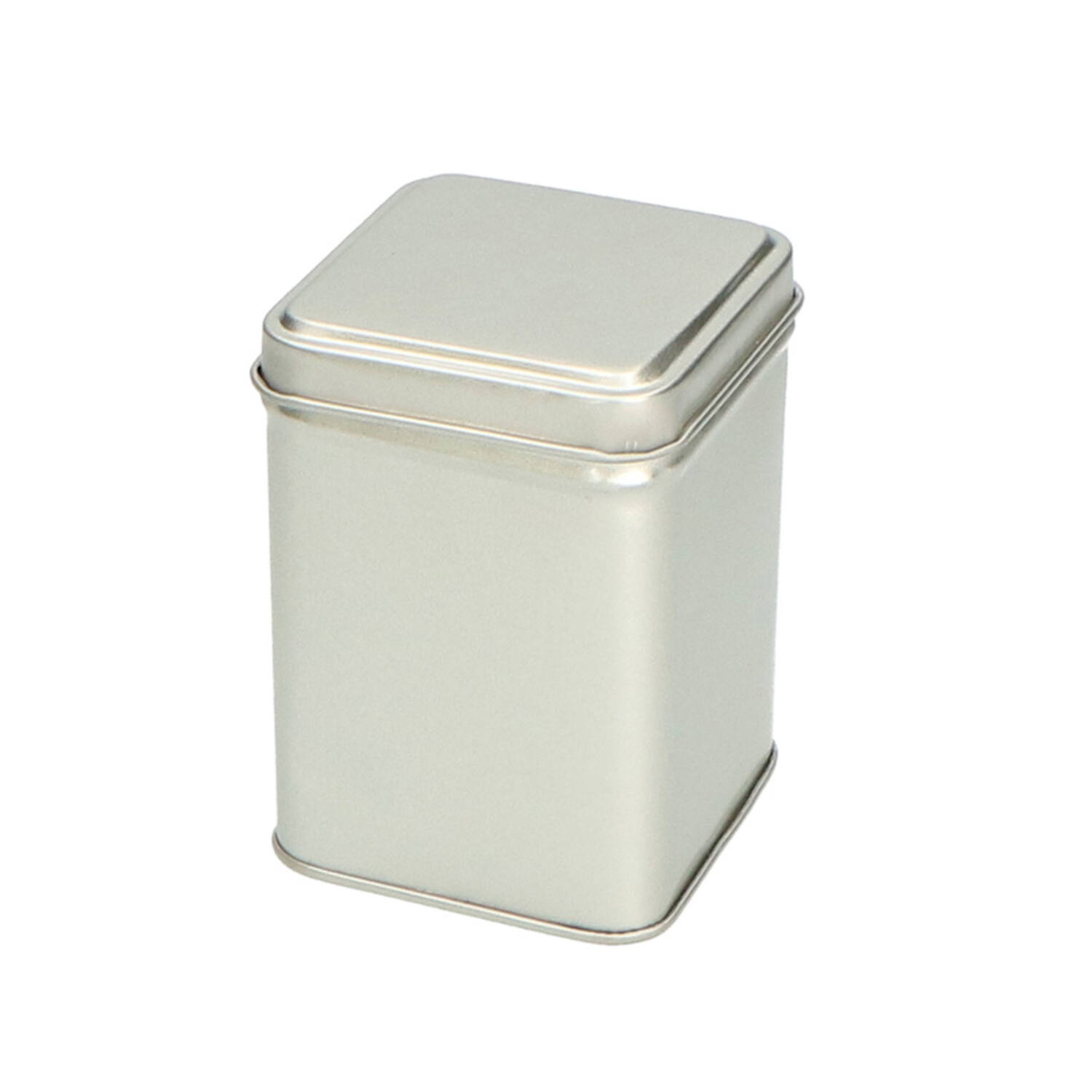 Compact vierkant zilverkleurig theeblikje met overschuifdeksel, geschikt voor ca. 50 gram losse thee.