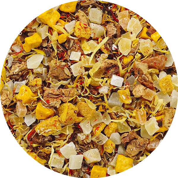 Gekonfijte mangostukjes (mango, suiker, voedingszuur: citroenzuur), gekonfijte papajastukjes (papaja, suiker), appelstukjes, appelstukjes (appel, gemalen kurkumawortel), hibiscus, natuurlijk aroma, passievruchtkorrels (appelpuree concentraat, passievruchtconcentraat) (4%), physalis, goudsbloembloemen, saffloerbloemen.
