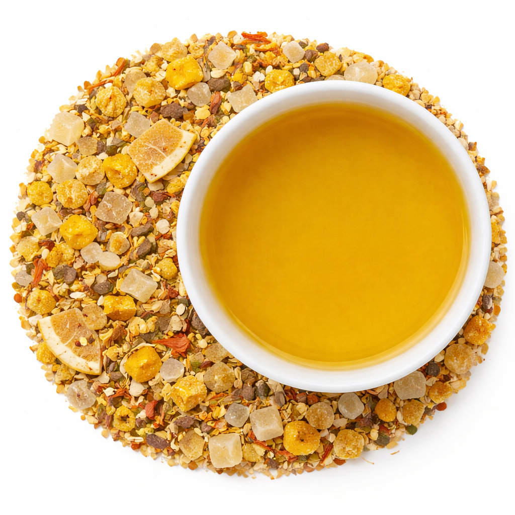 Yellow Tropical Bliss is een zonnige, exotische fruitmelange die direct een vakantiegevoel oproept. Deze thee geeft een prachtige helder gele kop, volledig dankzij natuurlijke ingrediënten zoals kurkuma en goudsbloem – zonder kunstmatige kleurstoffen.