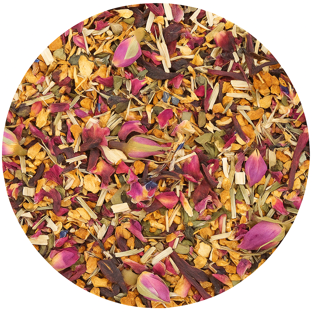 Een romantische, zachte melange die de zoete zomersmaak van rijpe perzik combineert met de florale elegantie van rozen. Deze verfijnde kruidige fruitinfusie brengt ontspanning en verwennerij samen in één kopje. Perfect voor elk moment van de dag – warm of als frisse ijsthee. De toegevoegde vitaminen maken het ook nog eens een heerlijke feel-good thee!
